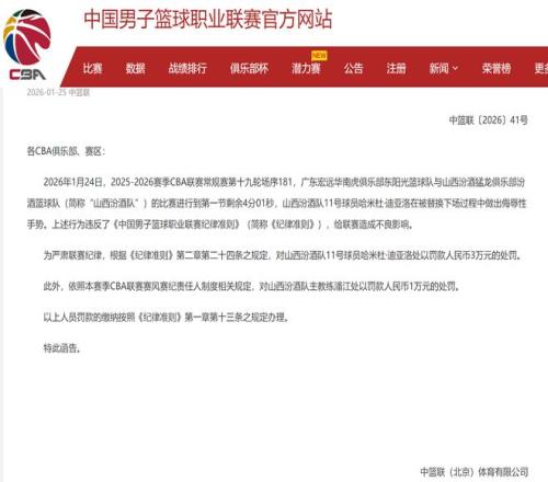 根据CBA联赛的相关规则,对迪亚洛进行罚款30000元的处罚。同时,山西队主教练潘江作为球队的赛风赛纪责任人,进行罚款10000元的处罚。