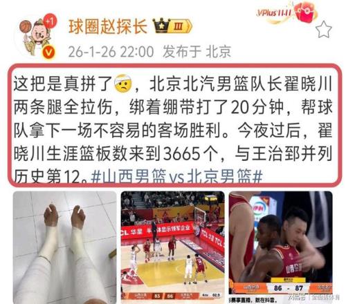 媒体人“球圈赵探长”对翟晓川带伤上场,给予了高度评价,他发文称:这把是真拼了,北京北汽男篮队长翟晓川两条腿全拉伤,绑着绷带打了20分钟,帮球队拿下一场不容易的客场胜利。今夜过后,翟晓川生涯篮板数来到3665个,与王治郅并列历史第12。