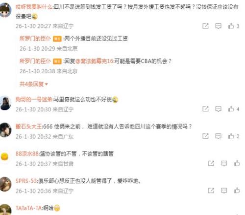 四川男篮在去年夏天,就深陷欠薪丑闻,当时球队本土球员集体写联名信控诉欠薪,且上赛季的外援也通过社媒表示他们也被欠薪。