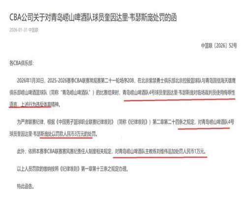 在赛后,CBA公司也是针对此事进行了调查,最终,认定青岛队外援奎因达里·韦瑟斯庞,在赛后,对当值裁判员使用侮辱性语言,这样的行为,严重违反了体育精神。