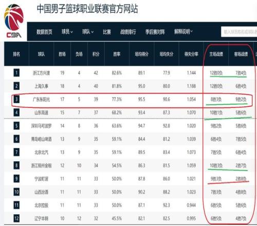 是什么数据呢?那就是本赛季,开赛至今,CBA20支球队,只有广东队的主场成绩不如客场成绩!你没有听错,广东队是CBA联赛唯一一支客场成绩比主场成绩好的球队。