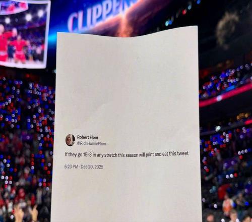 而一天后,也就是12月21日就有评论员发文称:如果快船队在接下来的任何一段赛程中,取得了15胜3负的成绩,他就会将自己说过的这番话打印出来,并且吃掉。值得一提的是,今天快船队球迷就把这个动态打印出来,带到了现场。而随着今天快船队126-89大胜篮网队,快船队自12月20日以来的18场比赛,战绩来到了15胜3负,愈发接近泰伦·卢的35胜20负了。