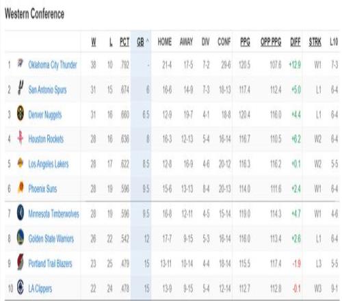 实际上大家会发现第一集团的差距并不大(除了雷霆),马刺只领先掘金0.5个胜场,掘金只领先火箭1.5个胜场,火箭只领先湖人0.5个胜场,湖人只领先太阳1个胜场,太阳与森林狼都是28胜19负。
