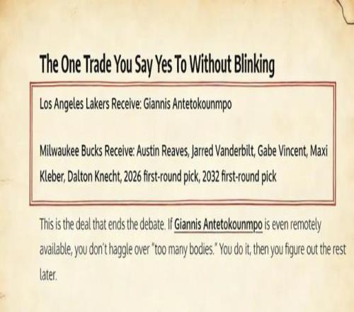 美媒《Fadeaway World》撰文建议,湖人应该将里夫斯、克莱伯、文森特、范德比尔特、克内克特以及2026年、2032年的首轮签送到密尔沃基,换回字母哥。