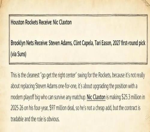 据悉,篮网中锋克拉克斯顿是火箭的潜在目标。为此,他们可能会提出亚当斯+卡佩拉+伊森+2027年首轮签(来自太阳)的报价。