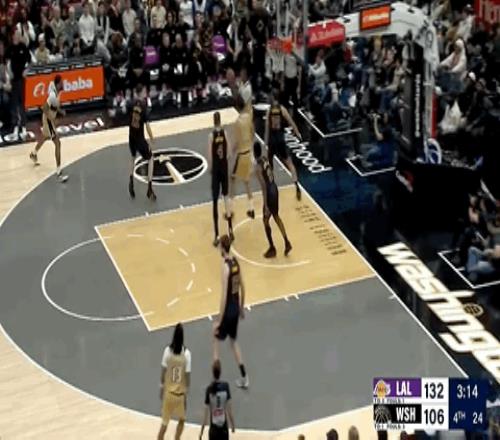 在东子三双的率领下,湖人全军出击,万箭齐发,半场湖人77-48领先奇才29分,直接打花了比赛。