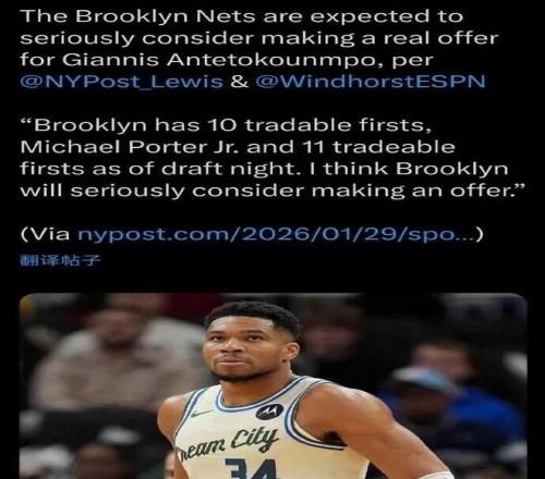 据ESPN名记 Windhorst和篮网队记Lewis联合报道,篮网预计将认真考虑一波为字母哥提供一份正式报价。