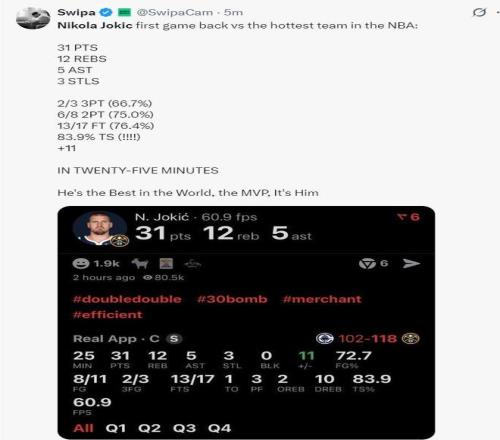 约基奇的复出无疑是本场最大的看点,在经历了一段时间的休战后,他迅速找回了比赛影响力,他在内线的进攻选择多样,无论是面对祖巴茨的篮下强攻,还是高位策应寻找空切队友,都处理得相当高效。
