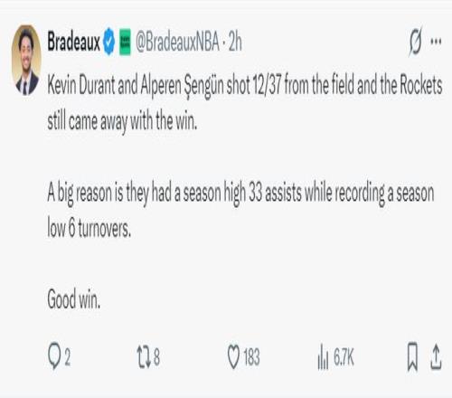 赛后火箭记者Bradeaux也为申京、杜兰特辩护,这两人本场比赛37中12手感不佳,但火箭还是赢球了,因为这两人合力送出15次助攻,全队33次助攻只有6次失误。