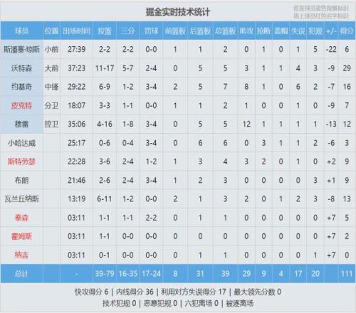 卡森-华莱士三分11中7砍下27分6板2断,得分和三分命中数都是生涯最高。掘金全场比赛从未领先过,此役过后跌至西部第三。最后看看数据:
