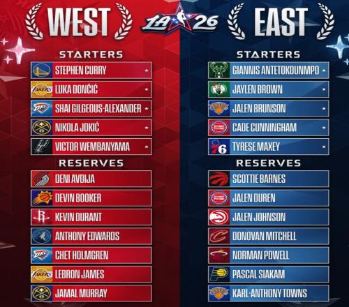北京时间2月2日,NBA官方公布了东西部全明星替补,西部替补:阿夫迪亚、布克、杜兰特、爱德华兹、霍姆格伦、詹姆斯、贾马尔穆雷;东部替补:巴恩斯、杜伦、杰约、多诺万、鲍威尔、西卡、唐斯。