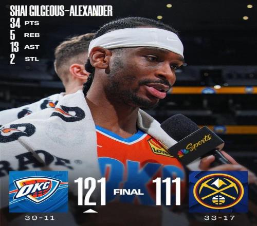 NBA雷霆121111击败掘金掘金2连胜后33胜16负西部第2