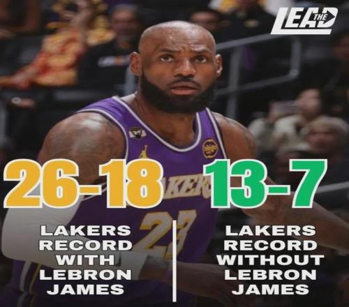 据数据统计,本赛季至今湖人在詹姆斯出战情况下取得26胜18负,胜率59.1%;反之13胜7负,胜率65%。