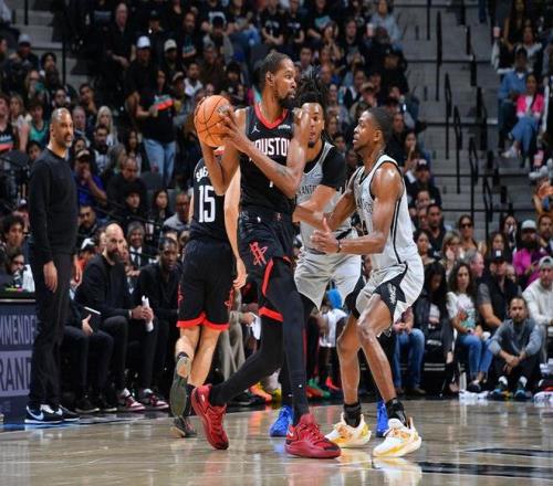 中场休息回来,双方进攻火力继续升级第三节均轰下35+得分,马刺更是单节狂轰40+得分。马刺内外开花率先一波16-4攻势扩大24分领先优势,火箭攻防两端均是被压制,第三节中段火箭已经69-96落后27分差距。火箭一波6-0攻势追分,杜兰特、阿门与申京接连得分,火箭继续反扑追到20分以内差距。火箭单节37-41输掉4分,三节结束火箭94-110落后马刺。前三节比赛,火箭三分16中5,杜兰特21+5+4与阿门23+7+5,引领4人得分上双;马刺三分28中13,文班亚马25+7+3帽与卡斯尔23分,引领5人得分上双。