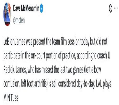 詹姆斯因左肘挫伤、左脚关节炎已经连续缺阵两场比赛,目前仍处于每日观察状态。雷迪克还表示,球队在训练中重点打磨了一些细节,尤其是挡拆防守和无球掩护。
