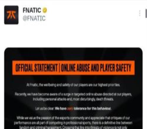 在FNC,我们始终将选手的身心健康与安全置于首位。近期,我们发现针对我们选手的网络暴力行为激增,其中包括人身攻击,以及最令人不安的——死亡威胁。