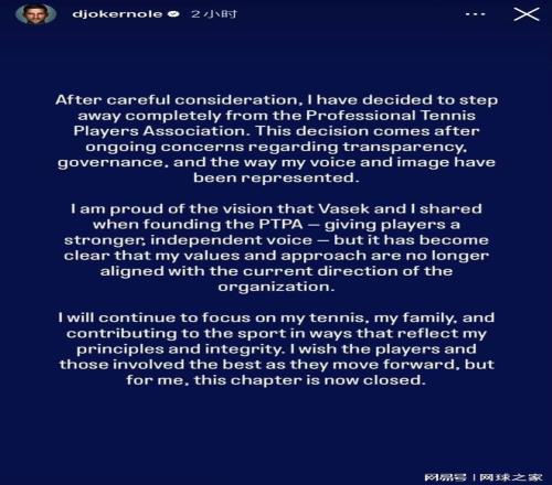 “经审慎考虑,我决定完全退出职业网球运动员协会(PTPA)。作出此决定,源于我长期以来对协会透明度、管理运作,以及自身观点与形象被呈现方式的诸多顾虑。