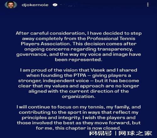 北京时间昨晚,塞尔维亚球王德约科维奇突然在个人社交媒体连发三帖,声明将正式退出由自己联合创办的职业网球运动员协会,即PTPA。德约给出的“退群”原因是对协会的透明度、管理方式,以及他本人的声音形象的呈现方式感到担忧,“经审慎考虑,我决定完全退出职业网球运动员协会。作出此决定,源于我长期以来对协会透明度、管理运作,以及自身观点与形象被呈现方式的诸多顾虑。我与波斯皮希尔当年联合创立PTPA,初衷是为球员争取更有力、独立的发声渠道,这份初心我始终引以为傲。但如今已明确,我的价值观与行事理念,与协会当前发展方向已不再契合。我将继续专注于网球事业、家人,并以符合自身原则与初心的方式为这项运动贡献力量。祝愿所有球员及相关人士未来一切顺遂,于我而言,这段旅程就此落幕。”