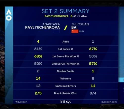 第二盘,白卓璇的一发进球率突然下降,对手在小白的二发上疯狂施压。帕芙柳琴科娃在这一盘不仅保住了自己的所有发球局,并且在第6局和第8局成功破发,将大比分扳为1比1平。