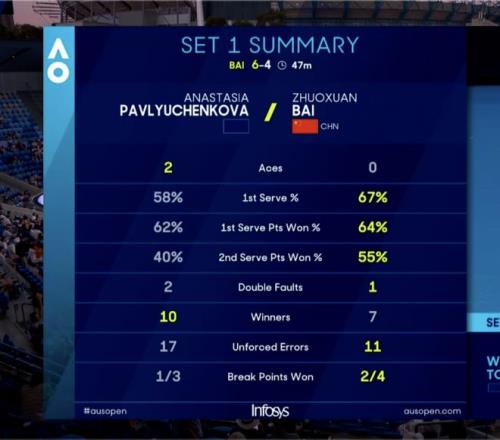 面对帕芙柳琴科娃的第一盘,白卓璇在前4局与对手互相保发。第5局,俄罗斯老将状态低迷,0比40送出3个破发点,白卓璇成功兑现第1个。第7局,中国小花再度破发,可惜随后一局,帕芙柳琴科娃实现回破,白卓璇仍有一个破发的优势。来到第10局的发球胜盘局,随着对手回球下网,白卓璇6比4取得大比分1比0的领先。