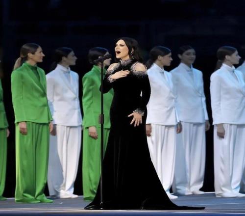 奏唱意大利国歌《马梅利之歌》时,登台的意大利女歌手Laura Pausini同样身着Giorgio Armani Privé高级定制黑色礼服裙,展现浪漫迷人的意式风情和品牌始终不变的优雅格调。