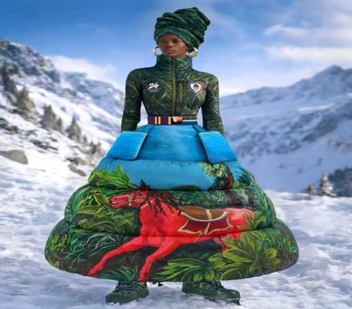 Jean 长期以来致力于通过时装讲述「跨文化叙事」,强调非西方文化在全球时尚体系中的主体性。本次为海地设计的队服延续这一立场——礼服采用手工绘制图案,并融入海地艺术家 Edouard Duval-Carrié 的视觉语言。红色骏马在蓝天与热带植被间驰骋,构成一个极具象征意味的画面。
