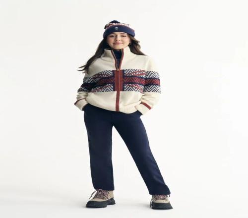 开幕式制服采用冬季白色系羊毛大衣,搭配绣有美国国旗图案的针织毛衣、对比色细节与优雅剪裁,整体呈现出一种「优雅复古滑雪风」。