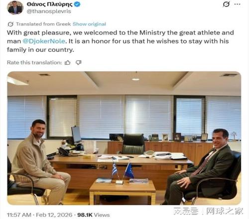 周四,希腊移民与庇护部长Thanos Plevris在X(原Twitter)上发文称,德约科维奇“希望与家人留在我们国家”,并分享了自己与这位塞尔维亚球星合影的照片,“我们非常高兴在部里欢迎这位伟大的运动员和杰出的人,他希望与家人留在我们国家,这对我们来说是一种荣幸。”