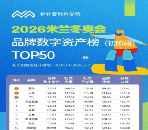 当米兰冬奥会与中国春节在同框,品牌营销的战场比赛场更早进入决赛圈。有人豪掷资源倾注,有人押注明星流量,大家都在拼谁能在双节点的情绪共振中抢到C位——直到秒针营销研究院一份《2026米兰冬奥初阶段品牌数字资产榜》的发布,这场混战才有了第一个被数据盖章的答案。