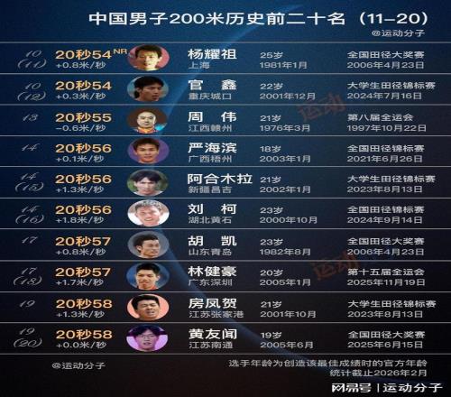 如果只看最快成绩,谢震业更是一枝独秀的存在,历史前16快成绩一度全都由他跑出。直到去年的全运会决赛,20岁小将施君豪20秒30夺冠,才占据了一个(并列)第十的位置。