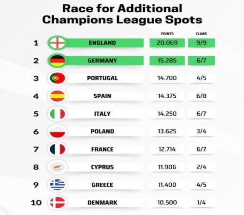 欧冠联赛阶段赛场结束,以下为本赛季目前各联赛欧战系数(前2名获额外欧冠名额):