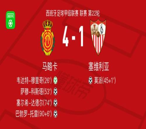北京时间2月3日西班牙足球甲级联赛 联赛 第22轮,马略卡主场对阵塞维利亚。马略卡韦达特-穆里奇破门,萨穆-科斯塔破门,塞尔希-达德尔破门,巴勃罗-托雷破门。塞维利亚莫派破门。最终比分马略卡 4-1 塞维利亚。