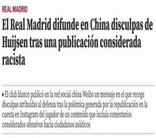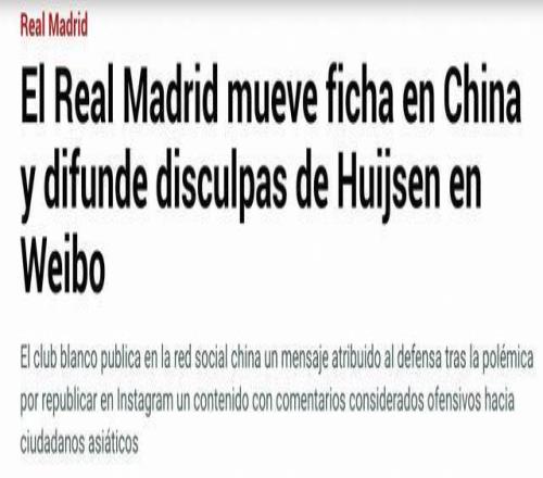 赫伊森在社交媒体转发辱华内容事件引发西班牙媒体关注,《阿斯报》《马卡报》《世界体育报》等西班牙多家知名媒体均对此事进行了报道。