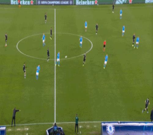 如果一定要分出高下,切尔西要稍好一点点,这体现在他们在将那不勒斯阵型抻开,包括通过争夺二点球来打转换的时候,还是可以在右半扇打出想要的配合: