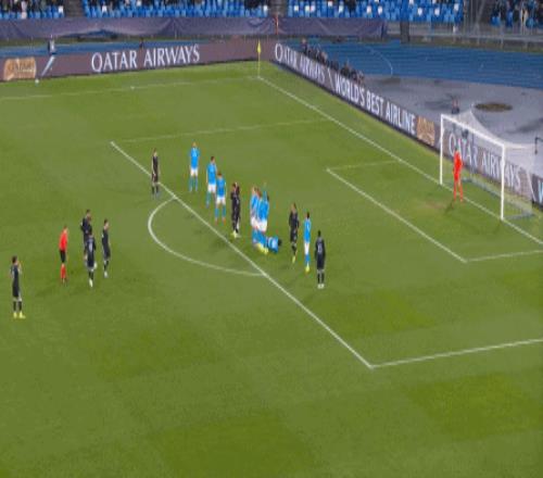 但在这次任意球的主罚过程中,那不勒斯送上了手球犯规,于是任意球直接变成了点球: