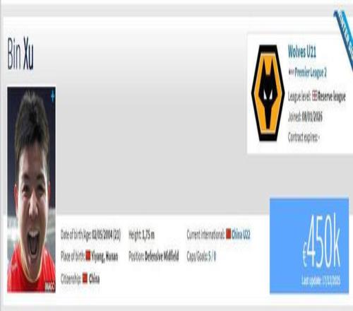 业界权威网站“转会市场”发布的信息显示,U23国足队长、青岛西海岸中场球员徐彬已经以自由球员身份,正式加盟英超狼队。