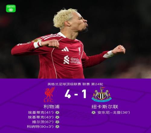 北京时间2月1日英格兰足球顶级联赛 联赛 第24轮,利物浦主场对阵纽卡斯尔联。上半场戈登率先破门,埃基蒂克三分钟两球反超比分,下半场萨拉赫助攻维尔茨低射建功,科纳特补射锁定胜局。最终利物浦4-1逆转纽卡斯尔联。