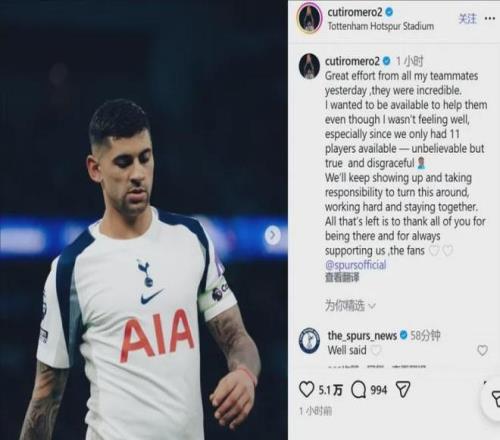 在解释了周末为何被换下场后,罗梅罗将矛头隐晦地对准了ENIC集团在转会市场上缺乏紧迫感的行为,热刺在阵容深度方面仍然显得单薄。他在Instagram上写道:“昨天我所有的队友都付出了巨大的努力,他们太不可思议了。”