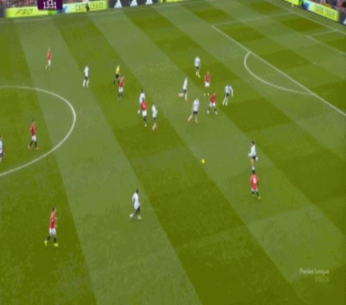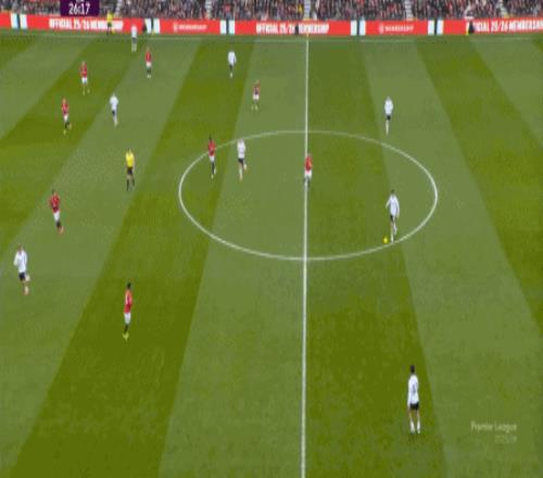 就是在这次进攻的早期阶段,曼联在场上呈现出了一个神奇的模样,那就是在富勒姆的四后卫身侧,一个曼联的球员都没有,大部分进攻手都聚在右侧打小球: