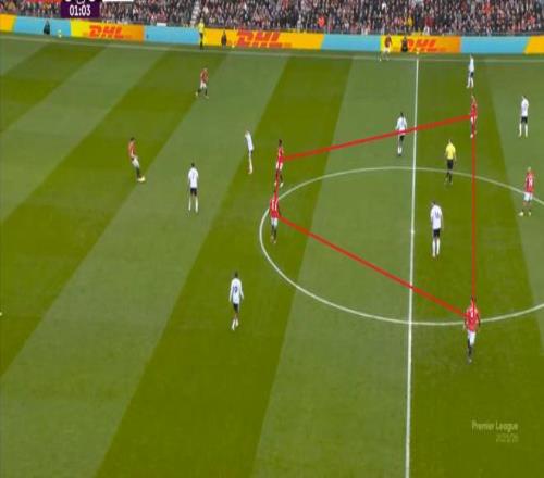 这说明位置变化的一大原因,可能是出于库尼亚作为南美球员对于站位纪律的忽视,但正因为卡里克在前场倾向于使用小个子球员,所以大家的活动范围其实都不小,而且很适应,于是在进攻发起的时候,曼联在前场的站位顺序已经变成了姆贝乌莫-布鲁诺-库尼亚:
