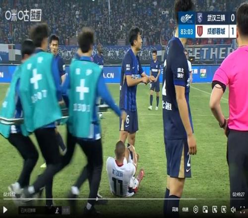 为何多出1次换人?原因是“成都姆巴佩”疑似大腿拉伤跑不动,走路一瘸一拐的,第二次倒地不起,最后成都蓉城不得不将他换下。值得一提的是,第一次倒地时韦林顿手指自己的左腿膝盖部位(下图),之后站起来勉强坚持几分钟后再次倒地。
