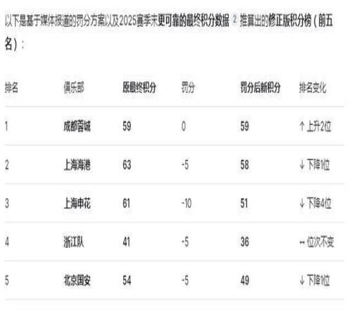 北京时间1月29日,今天上午10点,足球行业“假赌黑”专项整治行动的相关会议今天在北京召开。据五星体育、记者李璇等多个信息源消息,申花、天津新赛季罚10分,海港罚5分,国安罚5分,山东罚6分。其中上赛季积66分夺冠的上海上港被罚5分后积61分,比罚分后积60分排名第二的成都蓉城刚好多1分,打在上港屁股上的板子,轻重刚好合适。