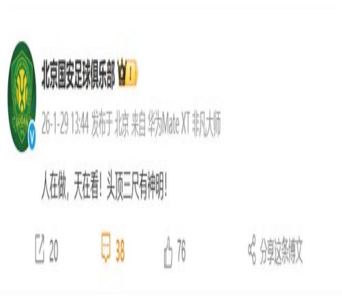 1月29日中午,北京国安足球俱乐部发布微博:人在做,天在看!头顶三尺有神明!