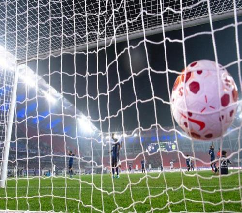 3月8日,武汉三镇队守门员方镜淇(右)向裁判示意越位,最后进球被判无效。新华社记者 肖艺九 摄