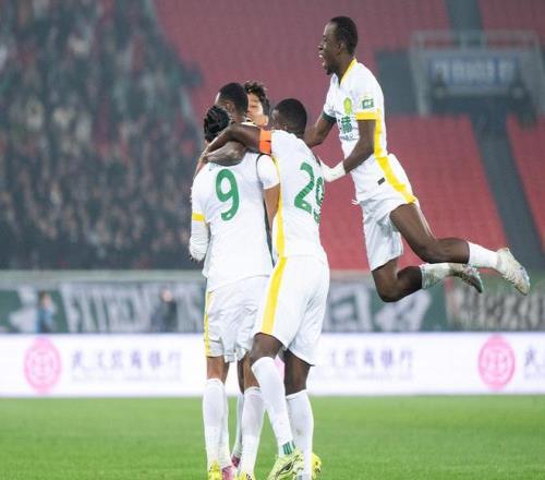 3月8日,北京国安队球员张玉宁(左一)进球后与队友庆祝。新华社记者 肖艺九 摄